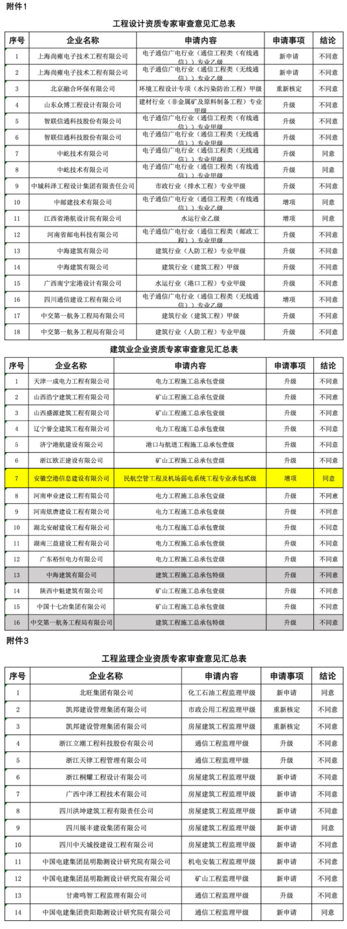 予以公示18项工程设计资质、16项建筑业企业资质、14项工程监理企业资质专家审查意见。
