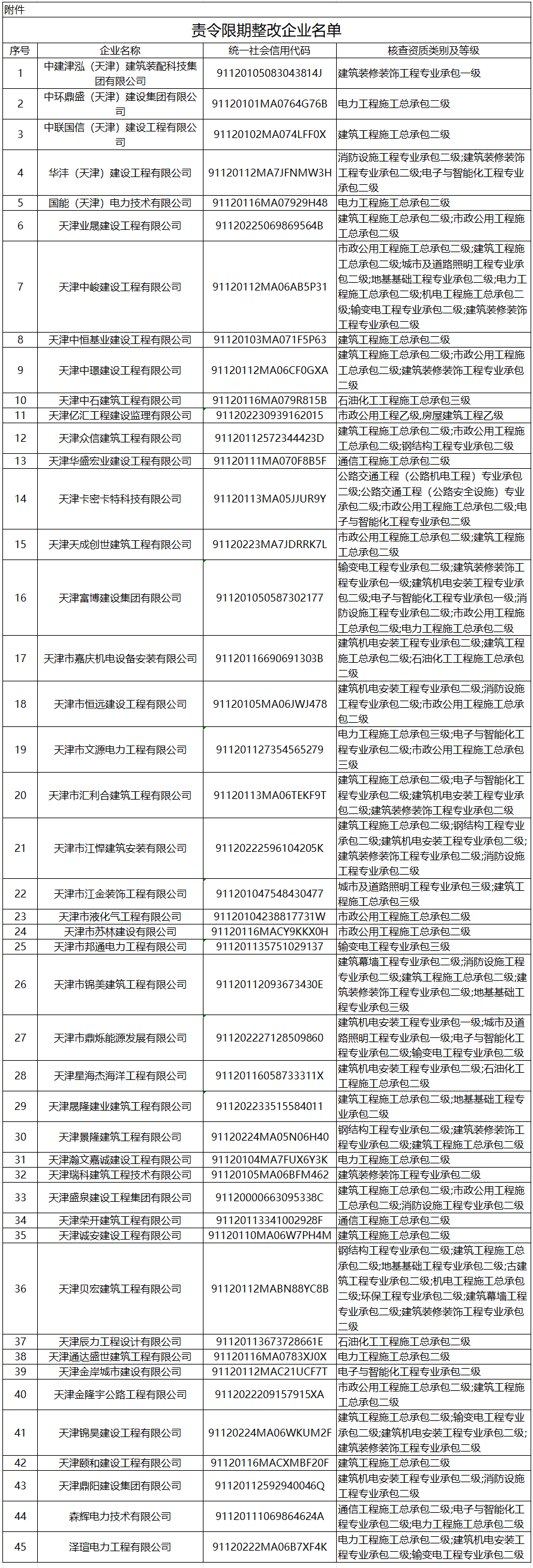 按照《市住房城乡建设委关于2025年建筑业、工程监理企业“双随机、一公开”动态核查情况的通报》有关要求、《建筑业企业资质管理规定》(住房城乡建设部令第22号)第二十八条规定,现公告责令因缺少注册人员核查结论为不合格的中建津泓(天津)建筑装配科技集团有限公司等单位于2025年11月19日前进行整改。