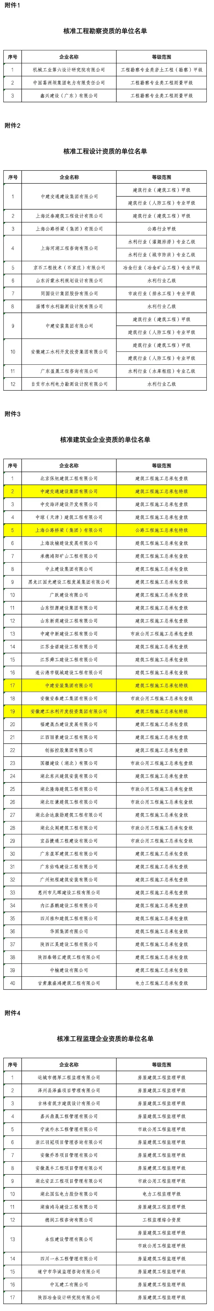 其中,中建交通建设集团有限公司、中建安装集团有限公司、安徽建工水利开发投资集团有限公司成功申请建筑工程施工总承包特级,上海公路桥梁(集团)有限公司成功申请公路工程施工总承包特级资质。