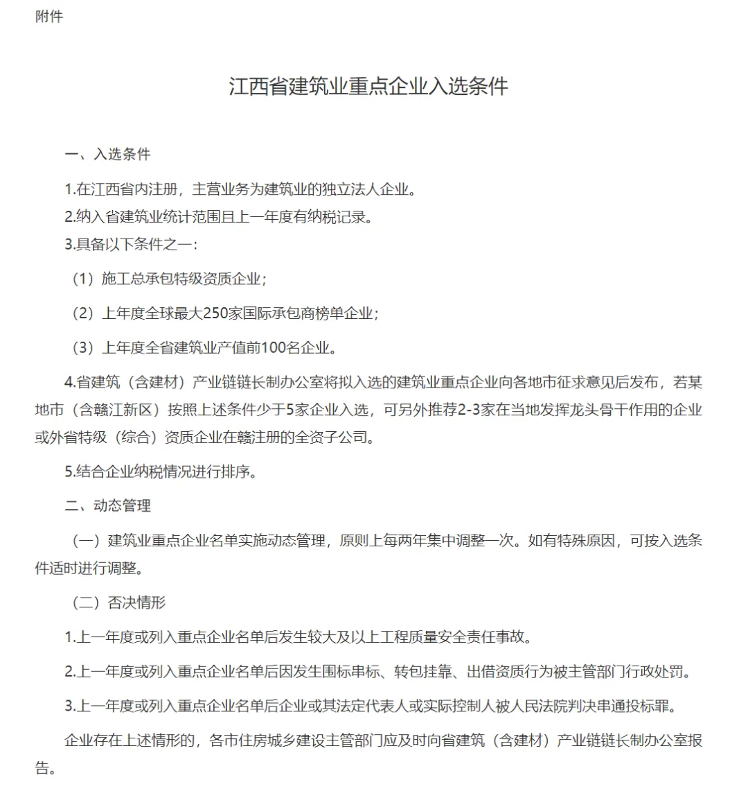 江西省住房和城乡建设厅发布关于印发《支持江西省建筑业重点企业发展十条措施》的通知。