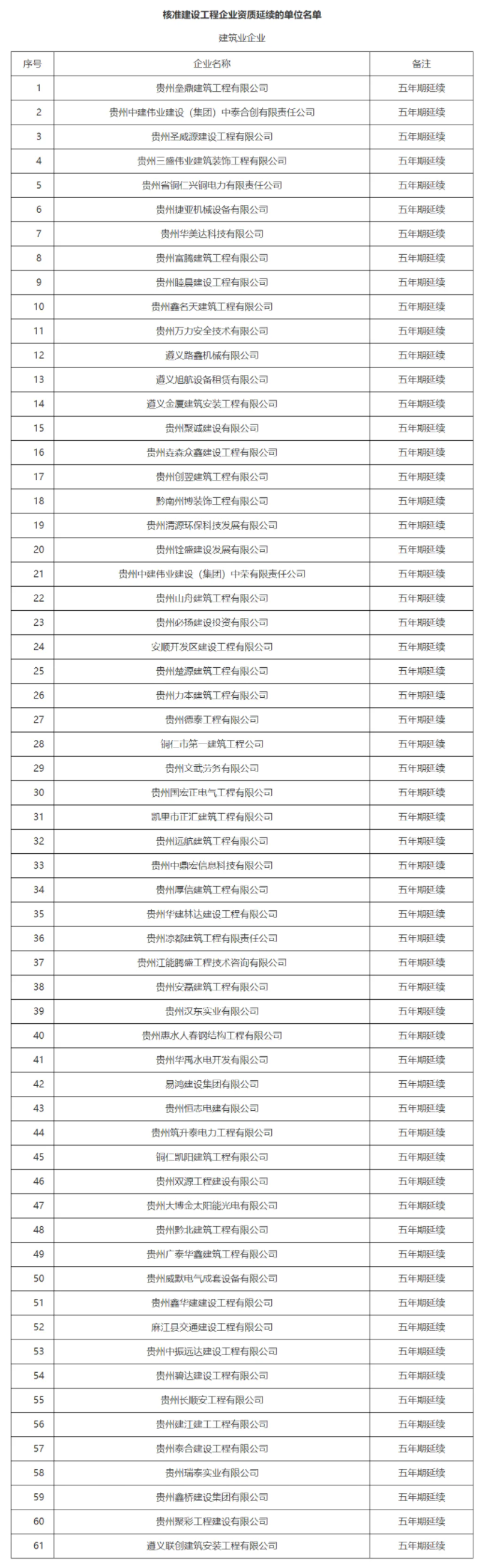 根据有关规定,予以公告省住建厅核准的建筑业企业资质延续、工程监理企业资质延续、工程勘察资质延续、工程设计资质五年期延续的单位名单,共计61家。