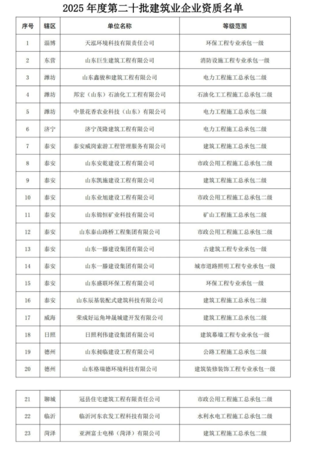 山东省住房和城乡建设厅关于2025年度第二十批建筑业企业资质名单的公告