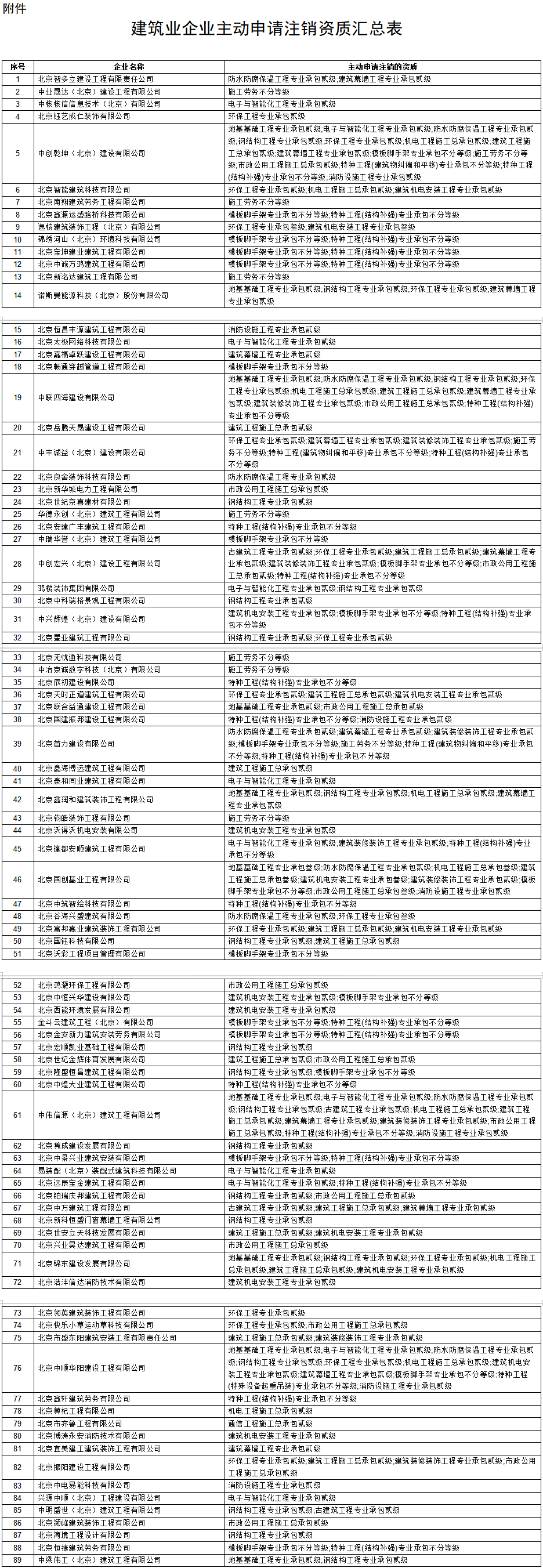 北京智能建筑科技有限公司等89家建筑业企业主动申请注销其部分资质,依据规定住建委已注销上述企业相应资质,保留企业其他原有资质。