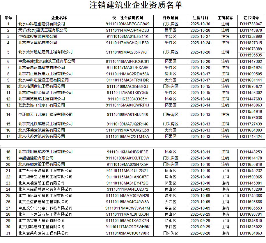 北京中科建创建设有限公司等31家建筑业企业工商营业执照已注销或被吊销,企业依法终止。