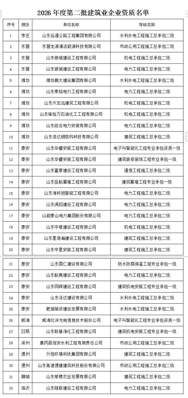 山东省住房和城乡建设厅发布关于核准2026年度第二批建筑业企业资质名单的公告。
