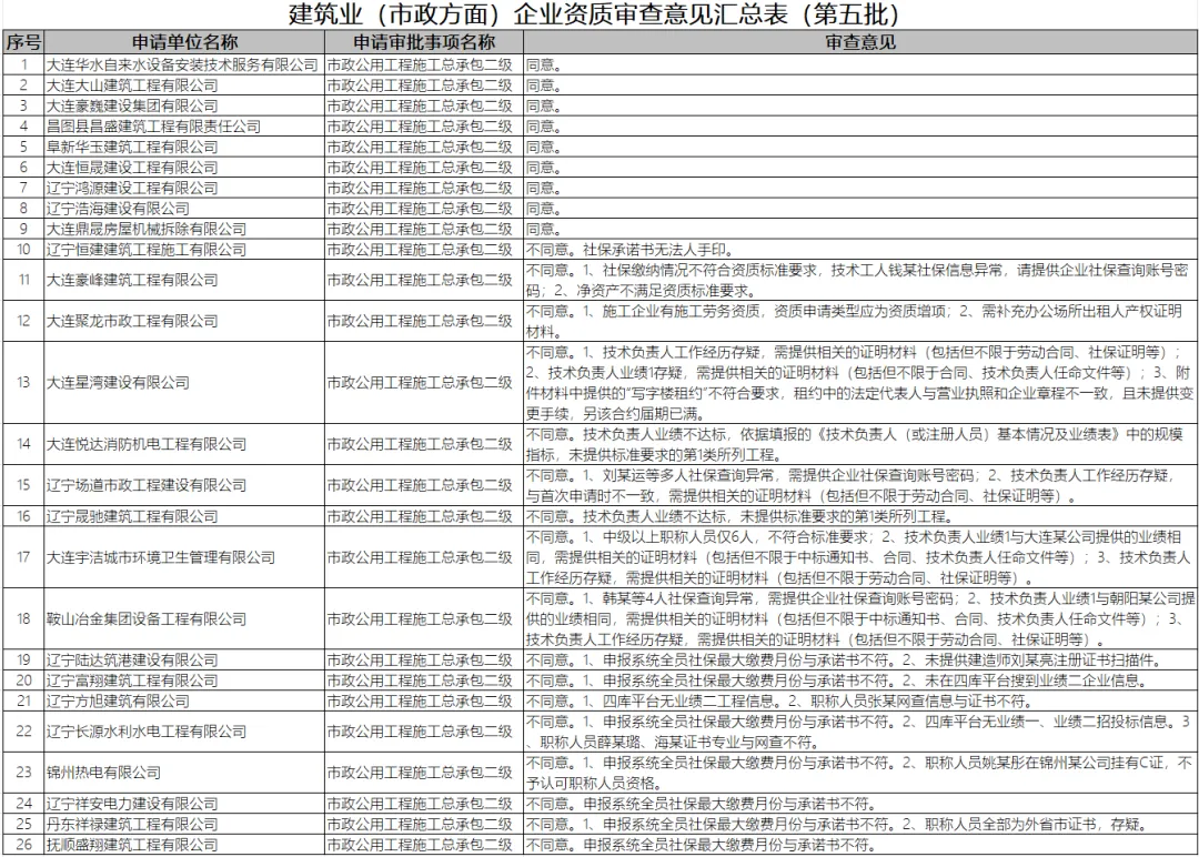 辽宁省住房和城乡建设厅发布关于2026年第五批建筑业(市政方面)企业资质审查意见的公示。