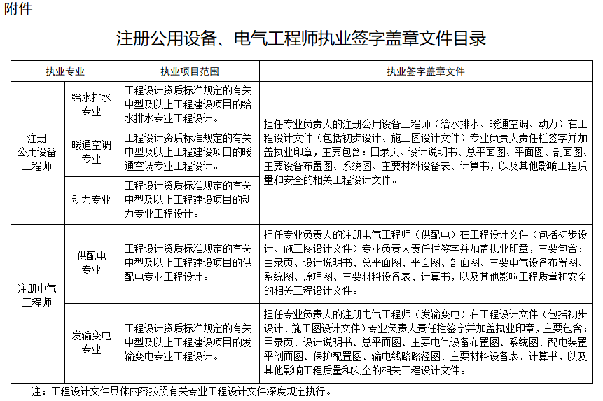 一、自2026年6月1日起,工程设计资质标准规定的有关中型及以上工程建设项目的工程设计,应由注册公用设备、电气工程师担任相应专业负责人。注册公用设备、电气工程师应在工程设计文件专业负责人责任栏签字并加盖执业印章,对该专业的工程设计文件负责。执业签字盖章文件目录见附件。