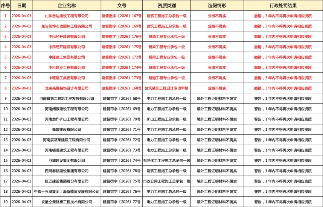 山东懋达建设工程有限公司等6家企业因核查业绩虚假,通报撤销8项相应资质,其中还包含2项建筑工程施工总承包一级资质,3年内不得再次申请。