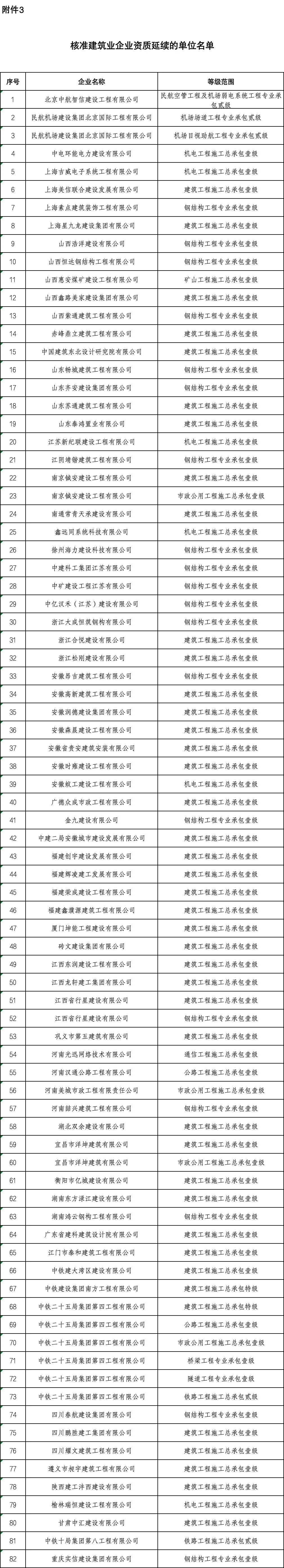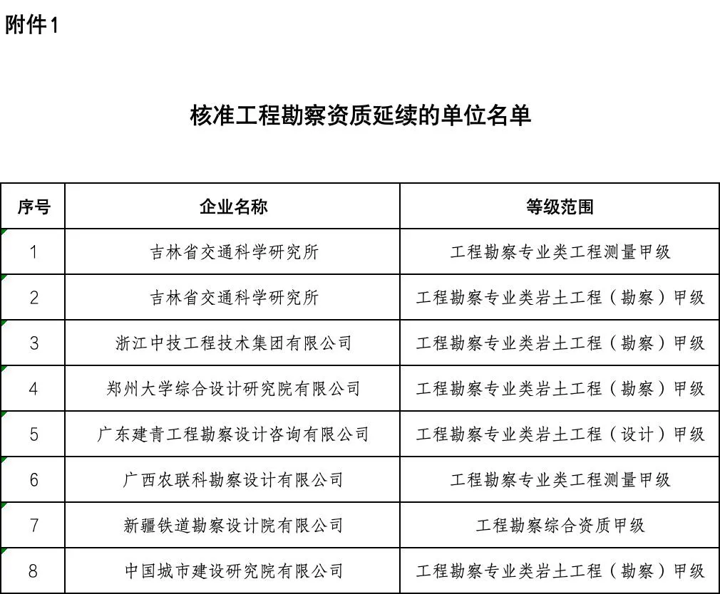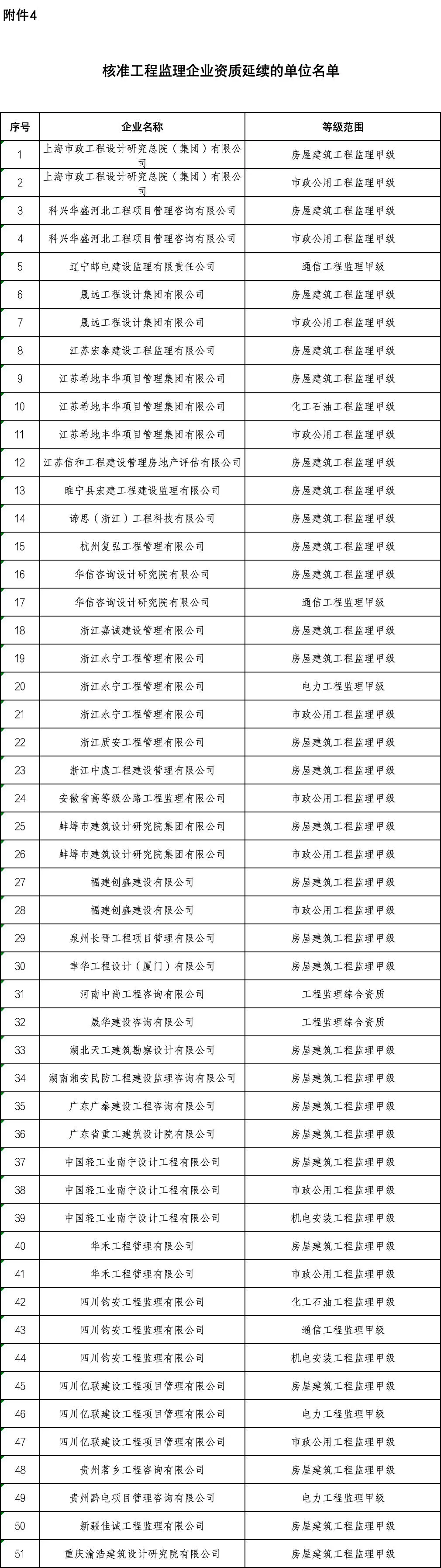 予以公告核准8项工程勘察资质、170项工程设计资质、82项建筑业企业资质、51项工程监理企业资质延续单位名单。